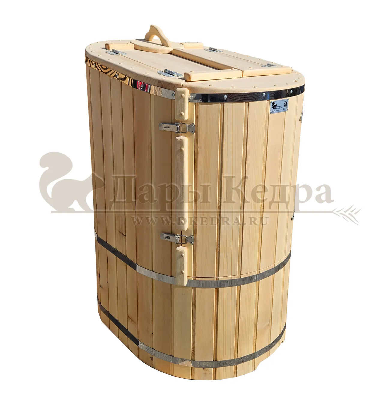 • Кедровая бочка (фитобочка) овальная со скосом «Профессиональная» Овальная фитобочка из кедра - это мини парная, которую можно использовать не только в спа-салонах, но и дома. Овальная модель более просторна и удобна в использовании. Толщина стенок составляет 40-45 мм, что позволяет увеличить срок службы изделия. Верхний скос делает положение головы более комфортным и улучшает обзор. Она оборудована откидными створками, дверцей и отверстием для головы. Во время парения человек сидит внутри кедровой бочки, а голова находится снаружи. Благодаря этому исключается возможность перегрева. Подлокотники из кедра, встроенные ручки на створках и двери делают эксплуатацию более удобной. Парение в фитобочке благотворно влияет на организм в целом: повышается иммунитет, выводятся шлаки и токсины, улучшается работа органов тела и состояние кожи.