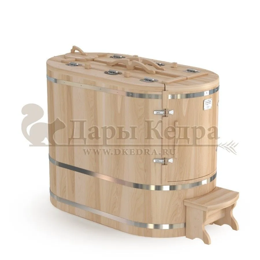 • Кедровая бочка (фитобочка) овальная со встроенным парогенератором «Профессиональная» Овальная форма этой кедровой бочки позволяет комфортно разместится даже высоким людям. Встроенный парогенератор исключает дополнительный монтаж. Ширина 78 мм позволяет занести бочку в помещение со стандартным проёмом в собранном виде. Толщина стенок 45 мм позволяет увеличить срок службы изделия. Подходит для коммерческого использования.