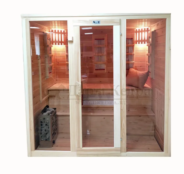• Трехместная комбинированная сауна из кедра с электрокаменкой Данную модель можно использовать как инфракрасную кабину, так и финскую сауну. Керамические нагреватели отвечают за сухое тепло. Они излучают инфракрасные лучи, которые равномерно прогревают тело человека. Электрическая печь нагревает кабину изнутри и позволяет сбрызгивать камни водой, слегка увлажняя воздух. Цилиндрический парообразователь применяется вместе с электропечью и служит для повышения влажности и образованию пара в сауне. Является доп опцией и оплачивается отдельно! Поочередно используя разные типы нагревателей можно усилить процесс очищения организма. Таким образом, шлаки удаляются как из внешних слоев кожи, так и из внутренних тканей.